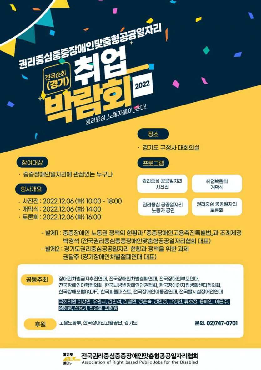 권리중심 중증장애인 맞춤형 공공일자리 전국순회(경기)취업박람회 안내 페이지 정보 작성자 햇빛촌 조회 1,561회 작성일 22-11-23 14:18 본문 권리중심 중증장애인 맞춤형 공공일자리 전국순회(경기)취업박람회 안내 목록 이전글2022년 11월 햇빛촌 소식지 22.12.08 다음글2022년 10월 햇빛촌 소식지 22.11.14 댓글목록 댓글목록 등록된 댓글이 없습니다.