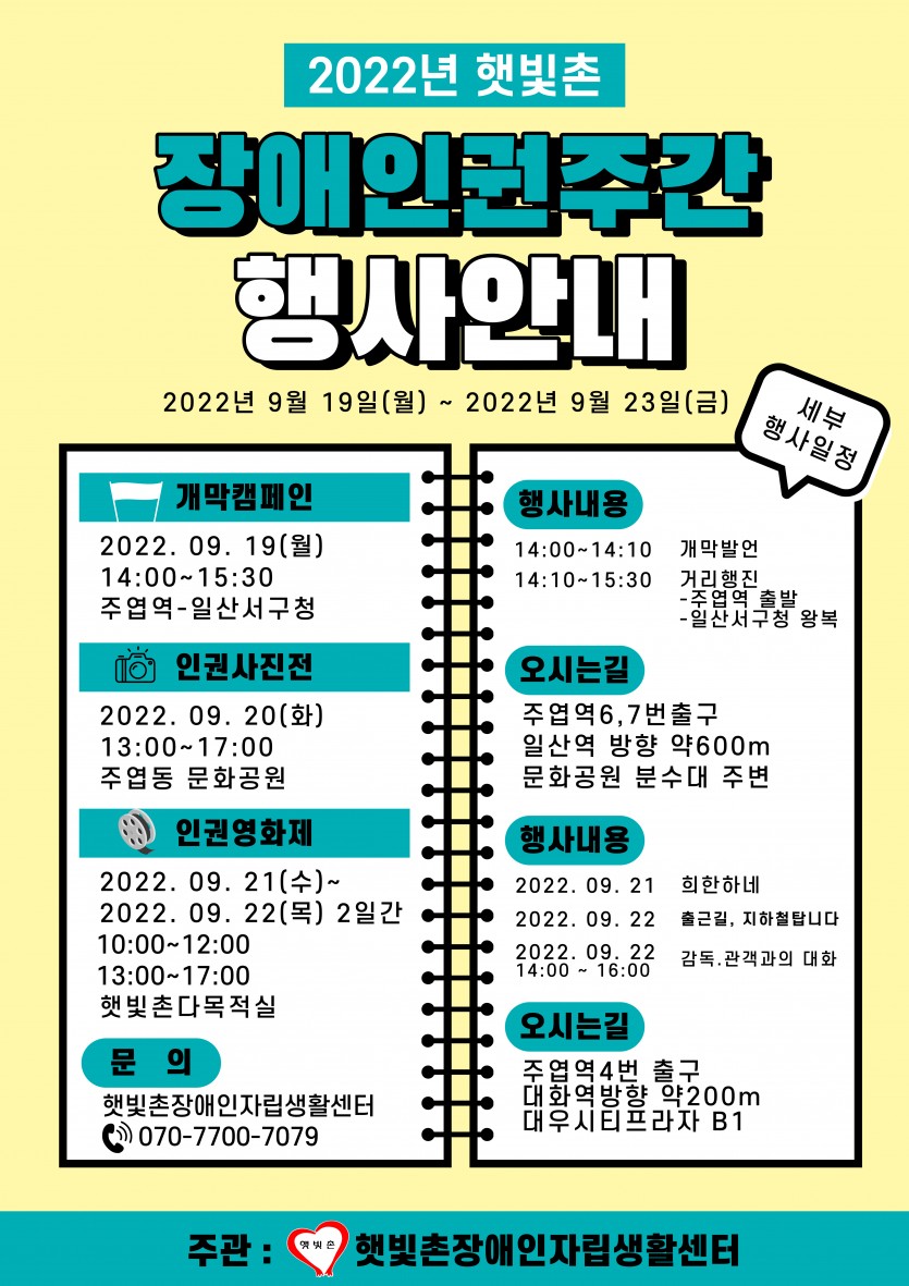 햇빛촌장애인자립생활센터는 2022년 9월 19일부터 23일까지(5일간)를 장애인권주간으로 설정하고 이 기간동안 장애인권주간 행사를 개최하기로 했다.