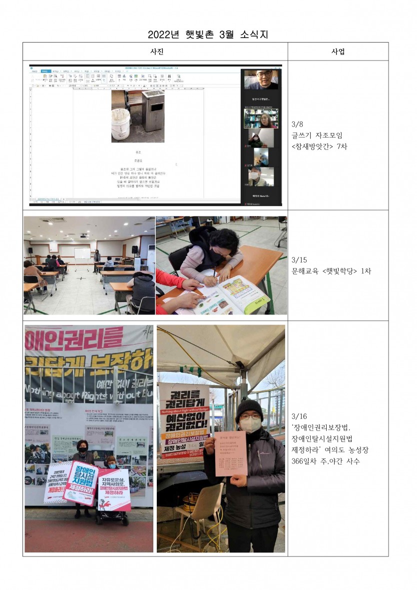 2022년 햇빛촌 3월 소식지 페이지 정보 작성자 햇빛촌 조회 1,792회 작성일 22-05-04 17:07 본문 2022년 햇빛촌 3월 소식지 목록 이전글2022년 햇빛촌 4월 소식지 22.05.04 다음글4/13 햇빛촌 센터 이성우 활동가의 이동권 관련 동행 취재 기사입니다. <헤럴드경제 기사> 22.05.04 댓글목록 댓글목록 등록된 댓글이 없습니다.