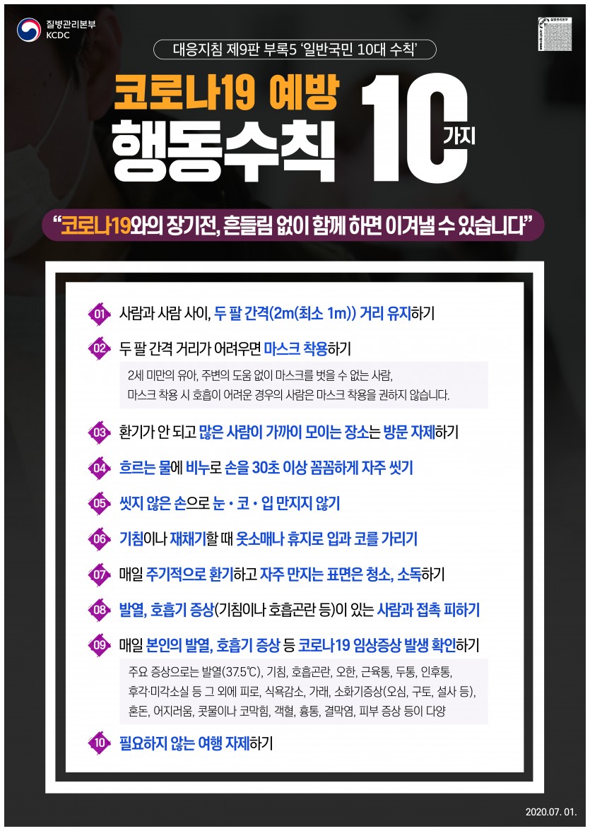 질병관리본부에서 발표한 코로나19 예방 행동수칙 10가지 입니다 페이지 정보 작성자 햇빛촌 조회 2,122회 작성일 20-07-07 13:34 본문 질병관리본부에서 발표한 코로나19 예방 행동수칙 10가지 입니다 목록 이전글정부에서 관리하는 '생활 속 거리두기' 사이트 안내드립니다. 20.07.09 다음글제 4회 햇빛촌 한마음 보치아대회를 개최합니다~ 20.07.01 댓글목록 댓글목록 등록된 댓글이 없습니다.