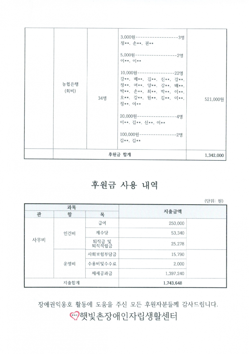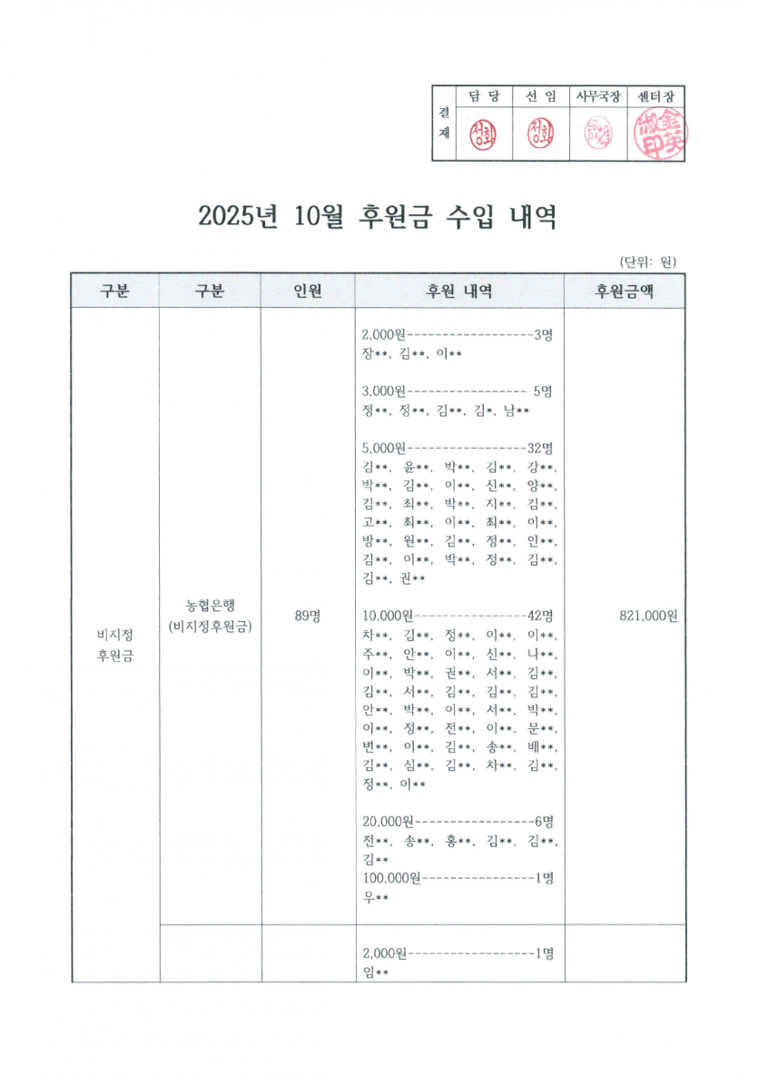 2025년 10월 후원금 수입, 사용 내역 보고 페이지 정보 작성자 햇빛촌 조회 616회 작성일 25-11-19 14:25 본문 2025년 10월 후원금 수입, 사용 내역 보고 목록 이전글2025 더불어 문화체험 참여자 모집 안내 25.12.04 다음글2025년 10월 햇빛촌 소식지 25.11.11 댓글목록 댓글목록 등록된 댓글이 없습니다.