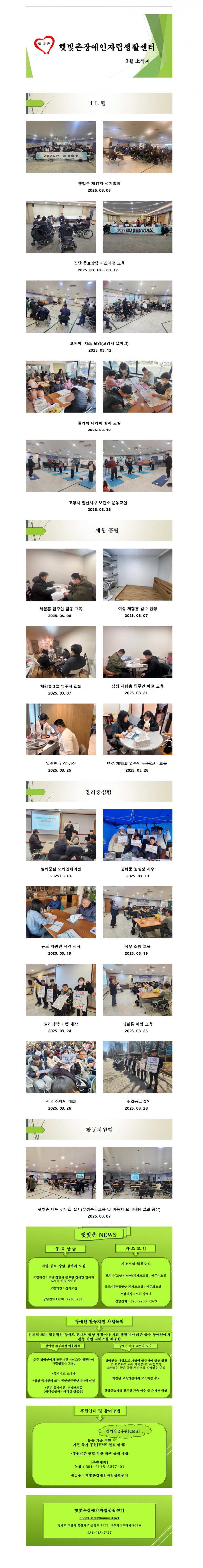 2025년3월 햇빛촌 소식지 페이지 정보 작성자 햇빛촌 조회 1,068회 작성일 25-04-03 10:10 본문 2025년3월 햇빛촌 소식지 목록 이전글2025년 권리중심 중증장애인 맞춤형 공공일자리 참여자 추가 모집 25.04.30 다음글2025년 2월 후원금 수입, 사용내역 보고 25.04.02 댓글목록 댓글목록 등록된 댓글이 없습니다.