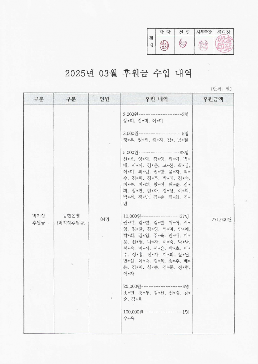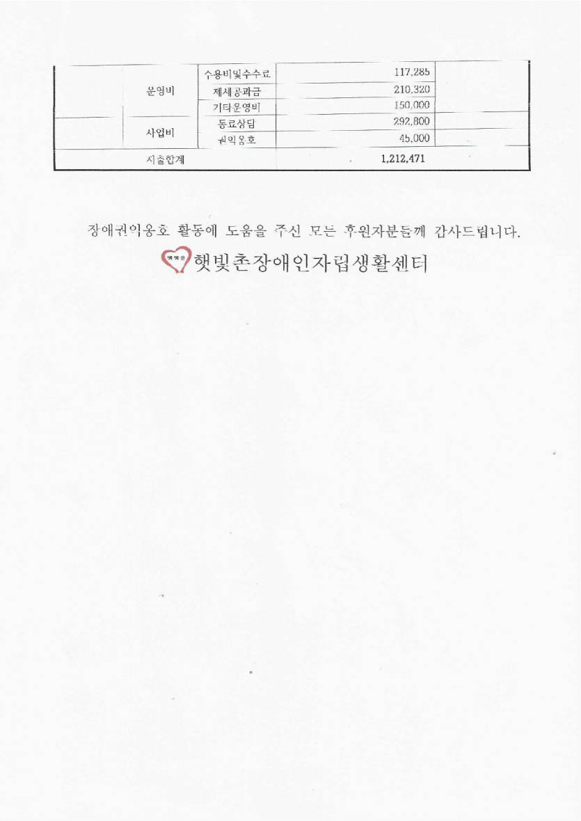2025년 3월 후원금 수입, 사용내역 보고 페이지 정보 작성자 햇빛촌 조회 883회 작성일 25-05-08 16:22 본문 2025년 3월 후원금 수입, 사용내역 보고 목록 이전글햇빛촌 2025년 IL 2차 운영위원회 공지 25.05.09 다음글2025년 권리중심 중증장애인 맞춤형 공공일자리 참여자 추가 모집 25.04.30 댓글목록 댓글목록 등록된 댓글이 없습니다.