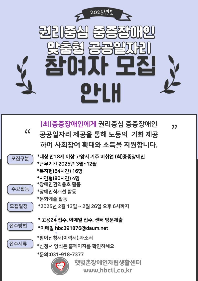 햇빛촌장애인자립생활센터는 2025년 경기도 권리중심 중증장애인 맞춤형 일자리 공모사업에