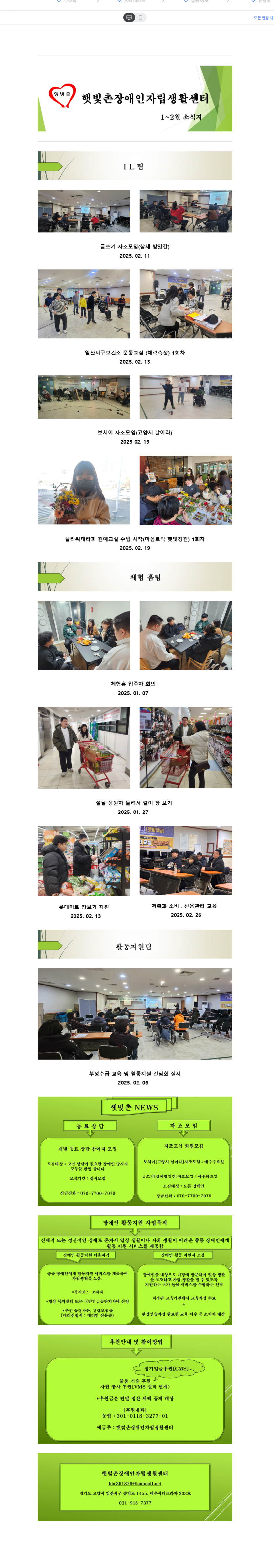 2025년 1~2월 햇빛촌 소식지 페이지 정보 작성자 햇빛촌 조회 1,087회 작성일 25-03-19 12:40 본문 2025년 1~2월 햇빛촌 소식지 목록 이전글연간 기부금 모금액 및 활동실적 명세서(2024) 25.03.28 다음글2025년 권리중심 중증장애인 맞춤형 공공일자리 참여자 모집마감 25.02.28 댓글목록 댓글목록 등록된 댓글이 없습니다.