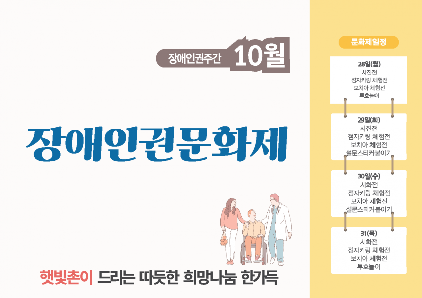 일별행사 : 10월 28(월) - 사진전, 점자키링체험전, 보치아체험전, 투호놀이