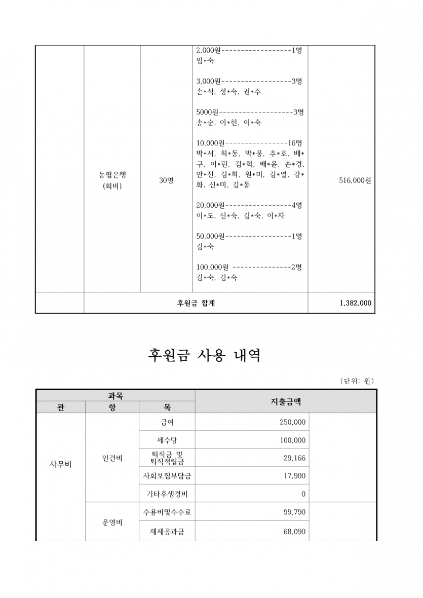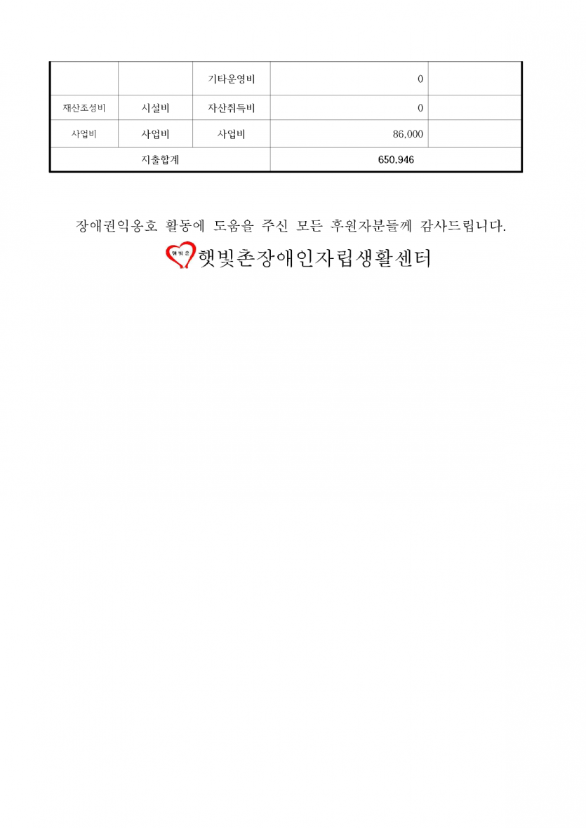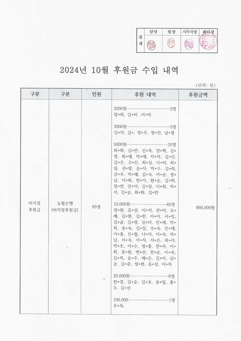 2024년 10월 후원금 수입, 사용 내역 보고 페이지 정보 작성자 햇빛촌 조회 1,347회 작성일 24-11-09 11:43 본문 2024 10월 후원금 수입, 사용 내역 목록 이전글2024년 10월 햇빛촌 소식지 24.11.11 다음글2024년 9월 후원금 수입, 사용내역 보고 24.11.09 댓글목록 댓글목록 등록된 댓글이 없습니다.