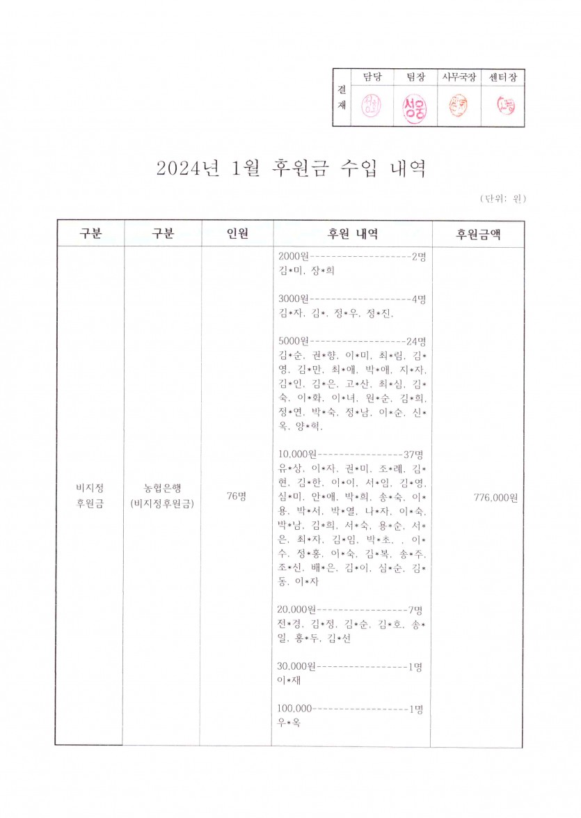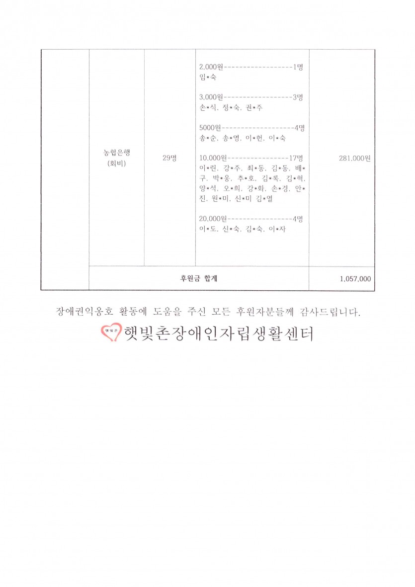 2024년 1월 후원금 수입 내역보고 페이지 정보 작성자 햇빛촌 조회 1,561회 작성일 24-02-21 14:56 본문 2024년 1월 후원금 수입 내역보고 목록 이전글2024년 정기총회 공고 24.02.21 다음글24년 IL 임시운영위원회(통합) 개최의 건 24.02.14 댓글목록 댓글목록 등록된 댓글이 없습니다.