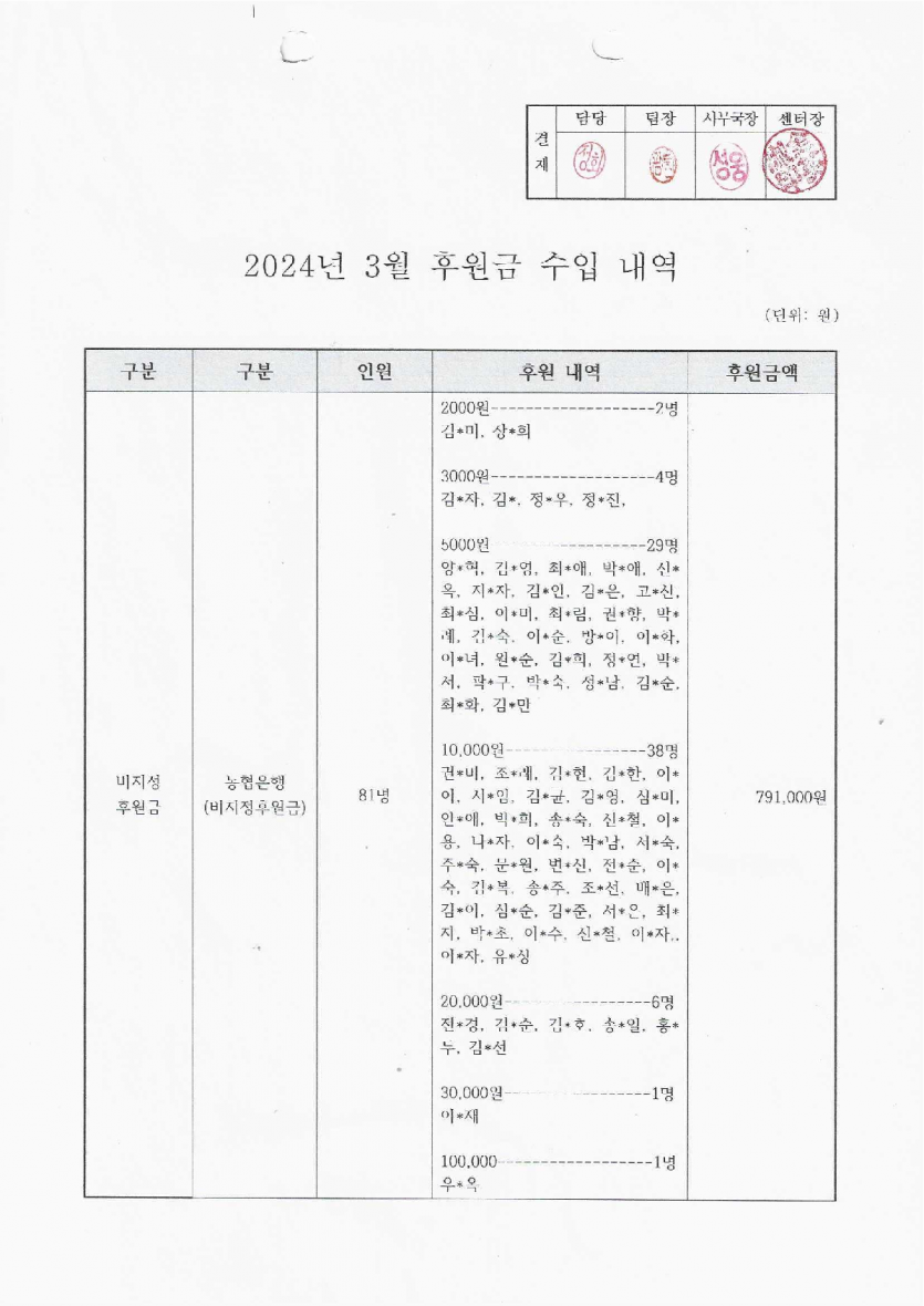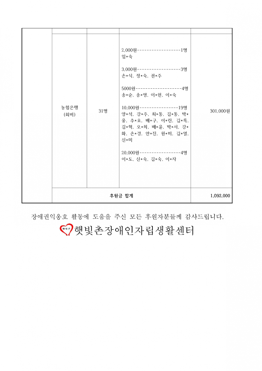2024년 3월 후원금 수입 내역 보고 페이지 정보 작성자 햇빛촌 조회 1,457회 작성일 24-04-25 16:07 본문 2024년 3월 후원금 수입 내역 보고 목록 이전글연간 기부금 모금액 및 활용실적 명세서(2023) 24.04.30 다음글2024년 3월 햇빛촌 소식지 24.04.10 댓글목록 댓글목록 등록된 댓글이 없습니다.