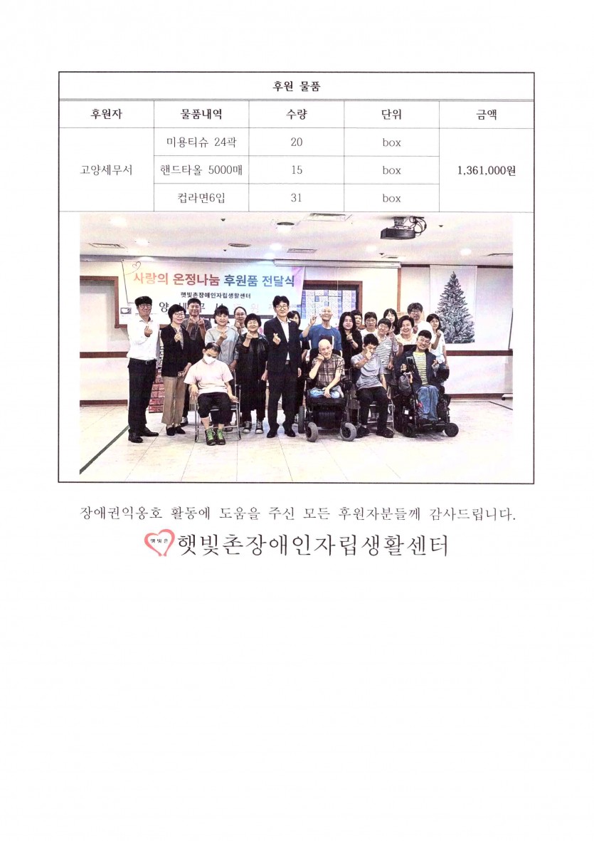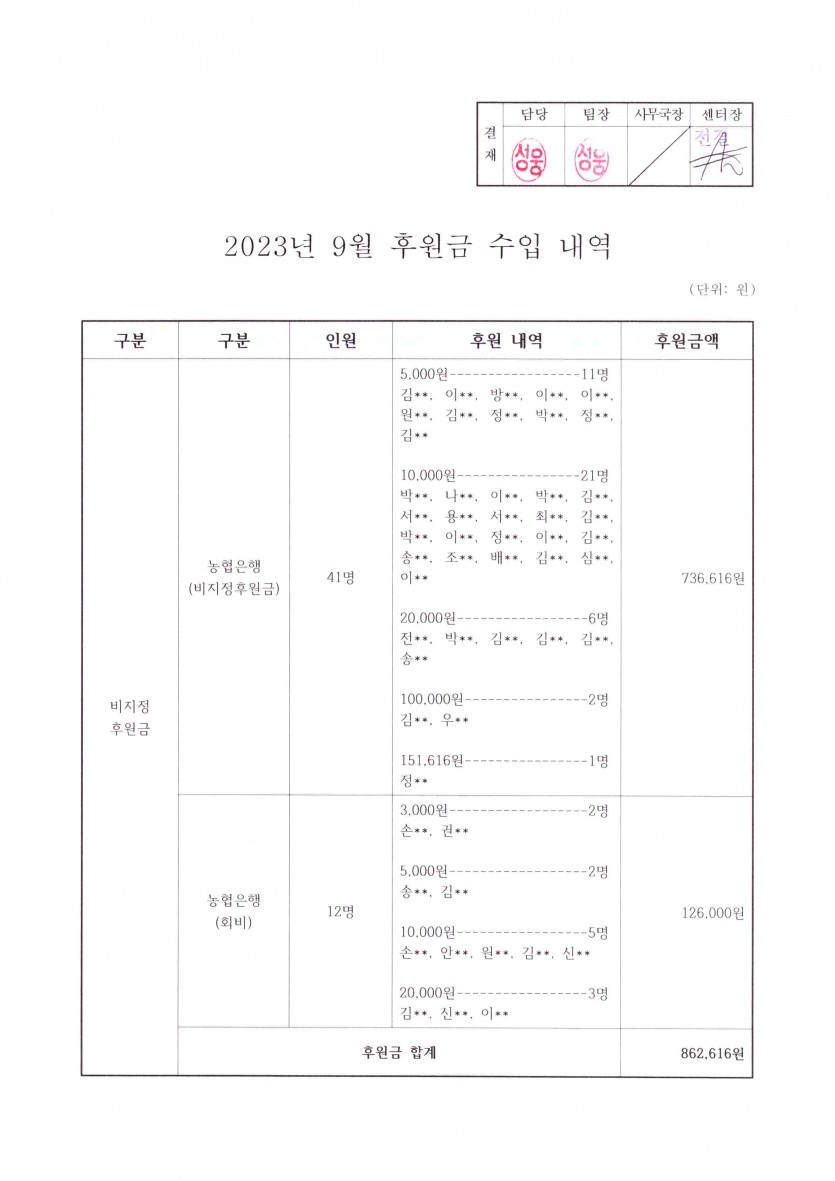 2023년 9월 후원금 수입내역보고 페이지 정보 작성자 햇빛촌 조회 1,545회 작성일 23-11-22 17:35 본문 2023년 9월 후원금 수입내역보고 목록 이전글2023년 10월 후원금 수입내역보고 23.11.22 다음글2023년 8월 후원금 수입내역보고 23.11.22 댓글목록 댓글목록 등록된 댓글이 없습니다.