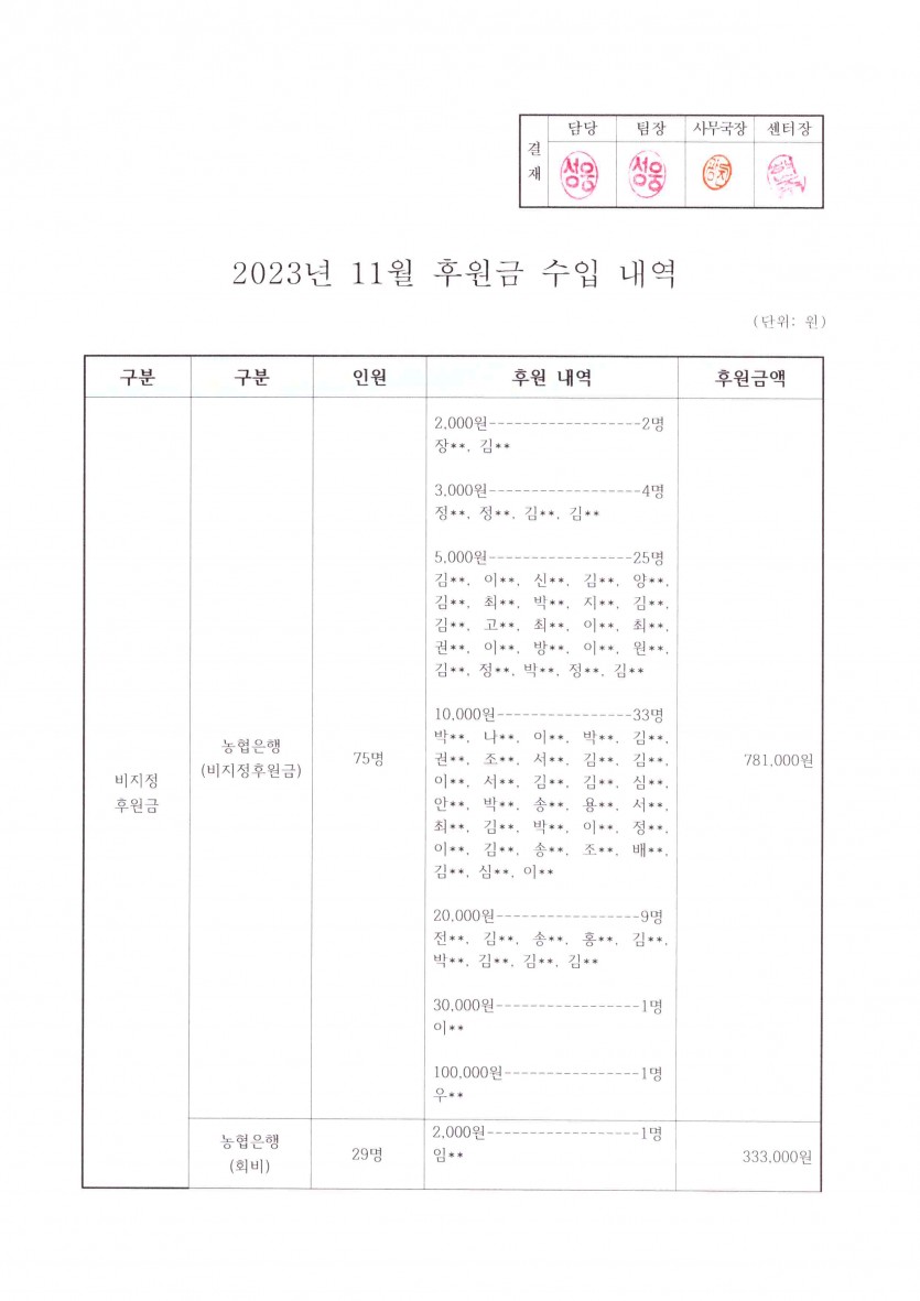 2023년 11월 후원금 수입내역보고 페이지 정보 작성자 햇빛촌 조회 1,552회 작성일 24-01-31 11:25 본문 2023년 11월 후원금 수입 내역보고 목록 이전글2024년 권리중심 중증장애인 맞춤형 공공일자리 참여자 모집 24.02.01 다음글2023년 12월 햇빛촌 소식지 24.01.29 댓글목록 댓글목록 등록된 댓글이 없습니다.