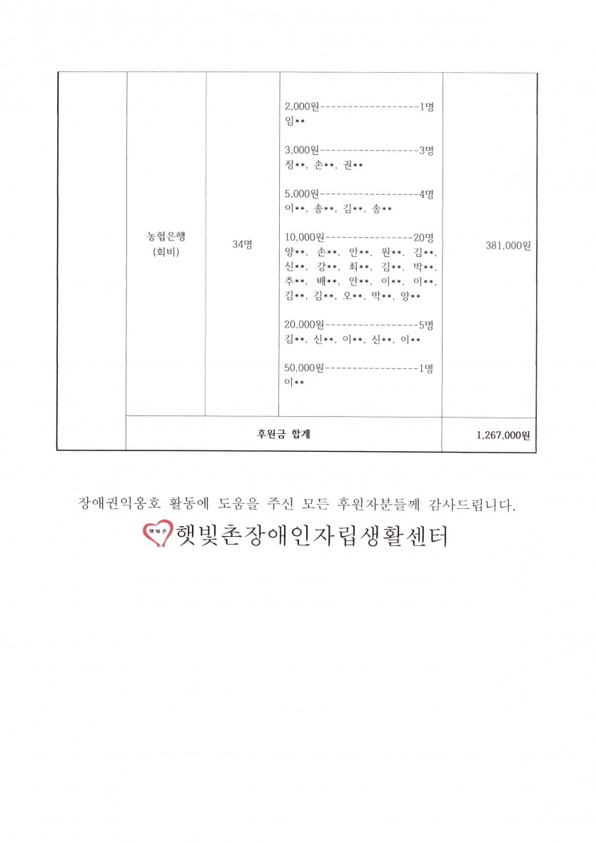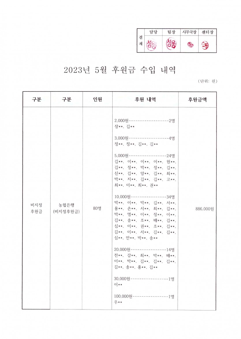 2023년 5월 후원금 수입내역보고 페이지 정보 작성자 햇빛촌 조회 1,536회 작성일 23-06-16 14:42 본문 2023년 5월 후원금 수입내역보고 목록 이전글2023년 5~6월 햇빛촌 소식지 23.07.10 다음글2023년 4월 후원금 수입내역보고 23.06.16 댓글목록 댓글목록 등록된 댓글이 없습니다.