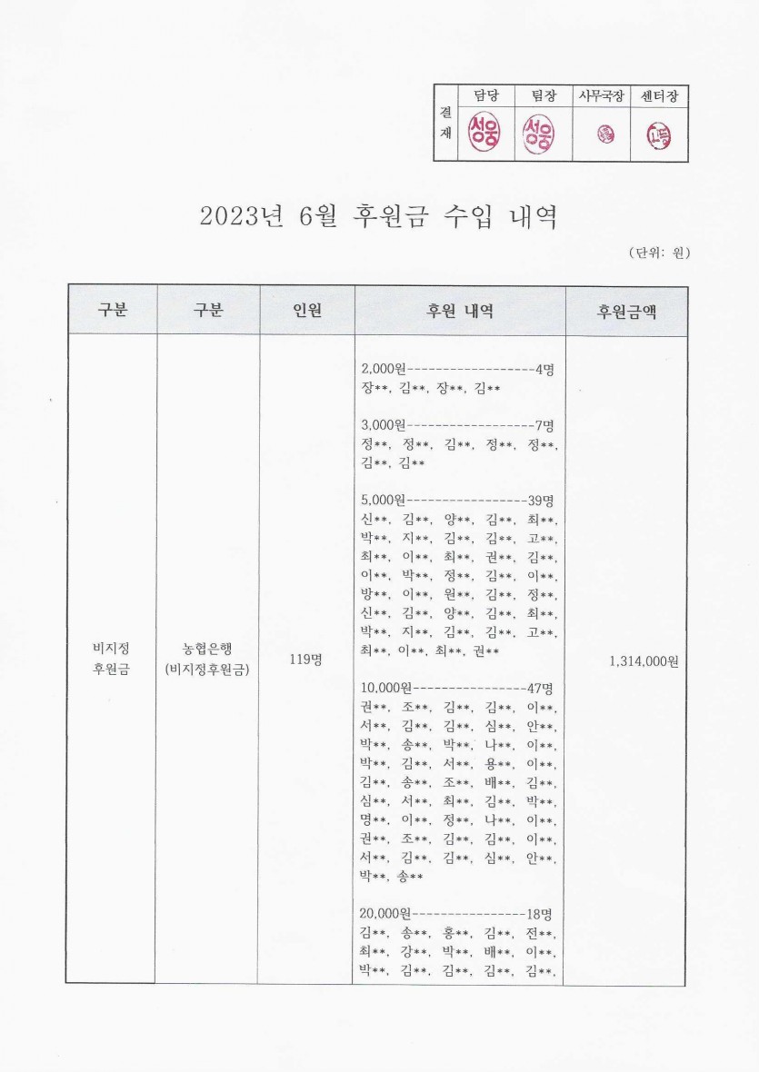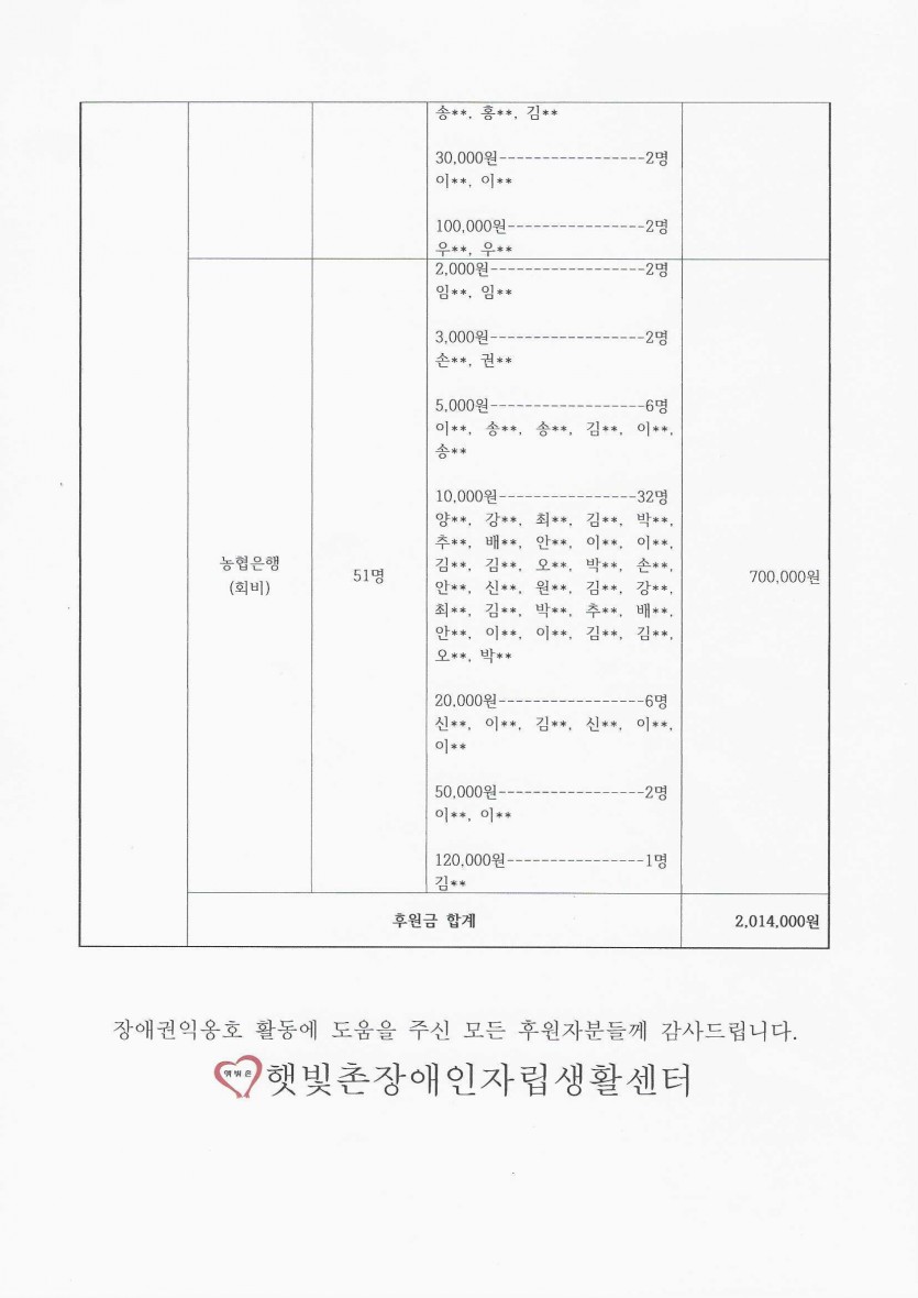 2023년 6월 후원금 수입내역보고 페이지 정보 작성자 햇빛촌 조회 1,611회 작성일 23-07-17 15:16 본문 2023년 6월 후원금 수입내역보고 목록 이전글2023년 권리중심 중증장애인 맞춤형 공공일자리 참여자 추가 모집 23.07.24 다음글2023년 5~6월 햇빛촌 소식지 23.07.10 댓글목록 댓글목록 등록된 댓글이 없습니다.