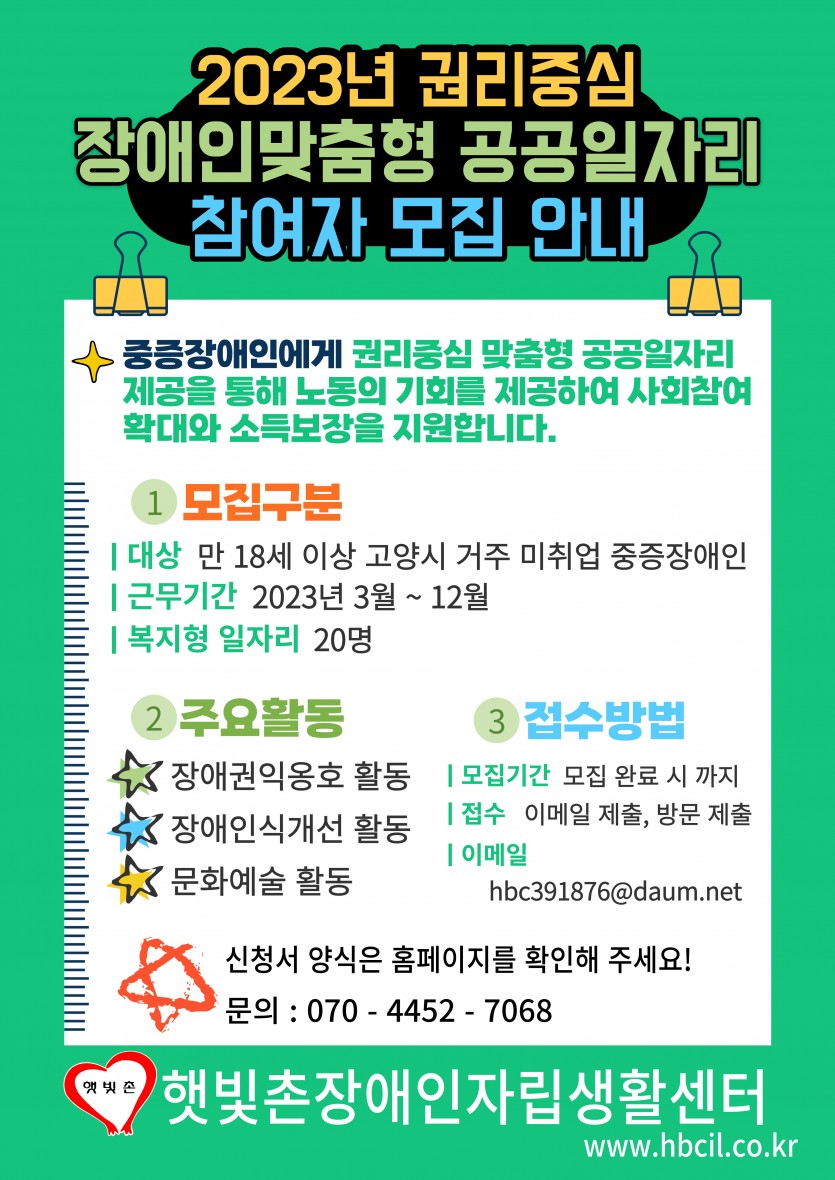 햇빛촌장애인자립생활센터는 「2023년 권리중심 중증장애인 맞춤형 공공일자리」 사업의