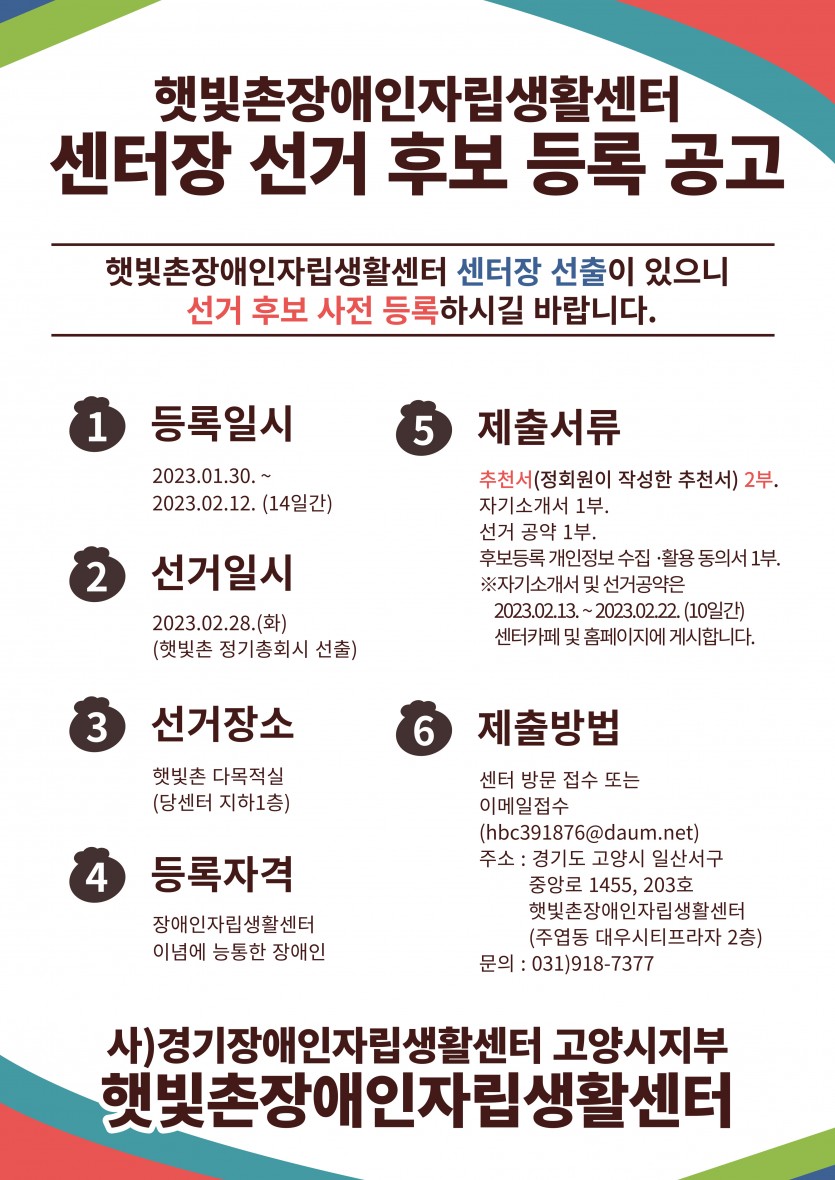 햇빛촌「고양시지부 대표」선거 후보 등록 공고