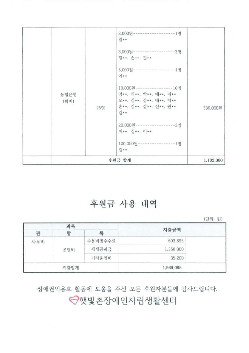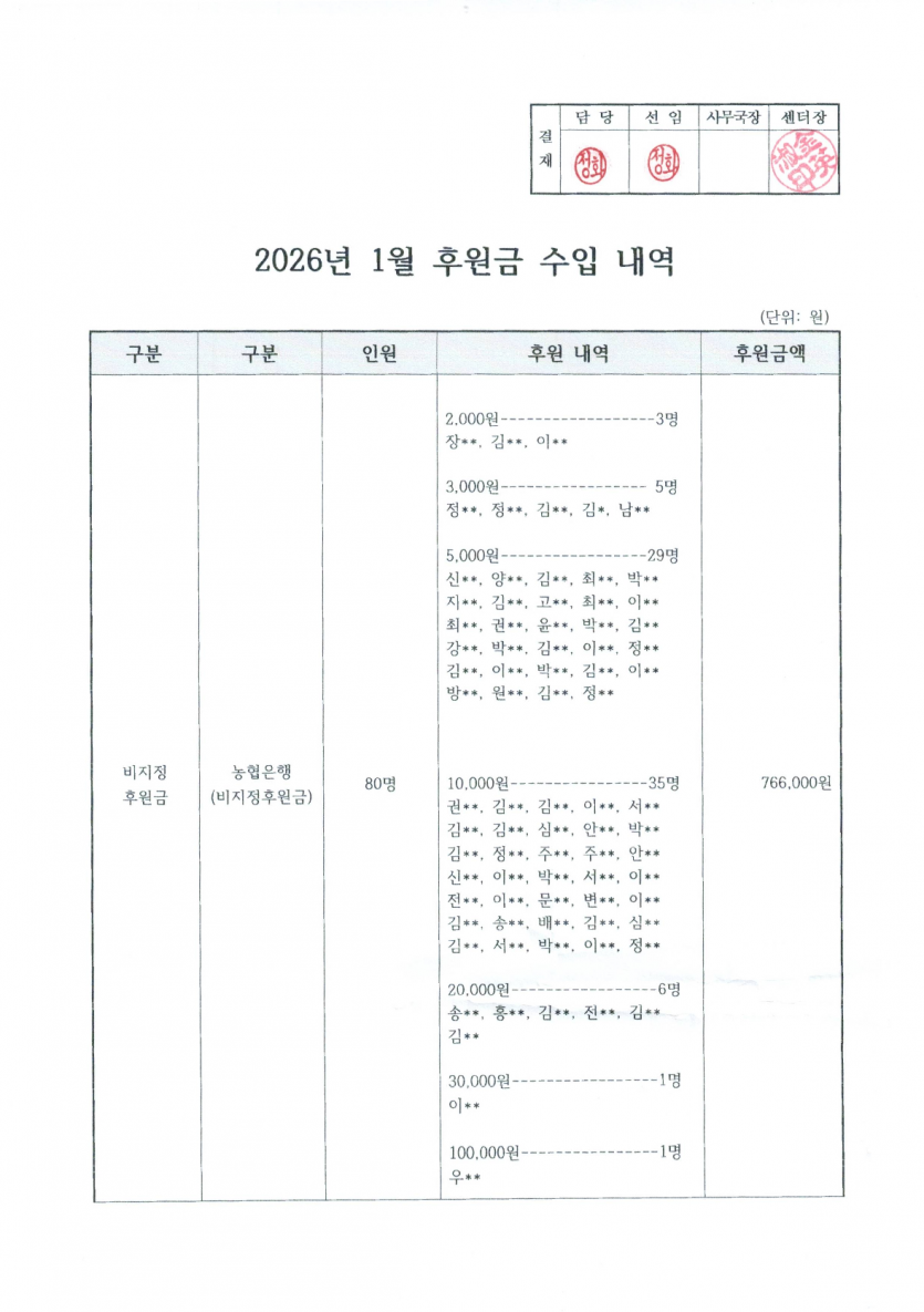 2026년 1월 후원금 수입, 사용 내역 보고 페이지 정보 작성자 햇빛촌 조회 205회 작성일 26-03-09 15:44 본문 2026년 1월 후원금 수입, 사용 내역 보고 목록 이전글햇빛촌 소식지 2026년 1~2월 26.03.10 다음글2025년 12월 후원금 수입, 사용 내역 보고 26.03.09 댓글목록 댓글목록 등록된 댓글이 없습니다.