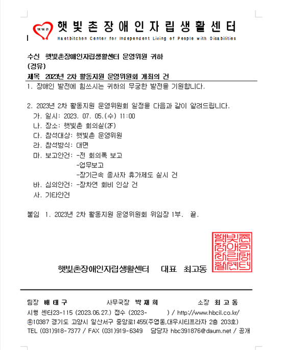 - 2023년 2차 활동지원 운영위원회 개최의 건공문.hwp (155.5K) 38회 다운로드 | DATE : 2023-06-27 15:44:08