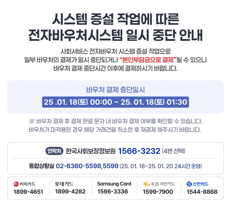 시스템 증설 작업으로 일부 바우처 결제가 일시 중단되거나 <<본인부담금 결제>>될 수 있으니